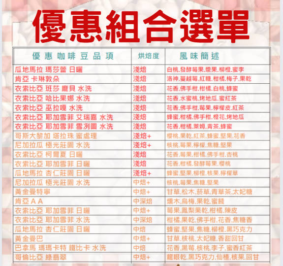 📣烘好的咖啡豆建議養豆一段時期,風味會更豐富圓潤好喝,淺焙豆建議養豆期約為10~20天,淺~中焙豆建議養豆期約為7~15天,中~中深焙豆建議養豆期約為5~10天(僅供參考,您可自行斟酌熟成適飲時間) 🎈優惠咖啡豆組合已享優惠特價,基於優惠擇優適用不重覆的原則,不適用其他折扣方案。